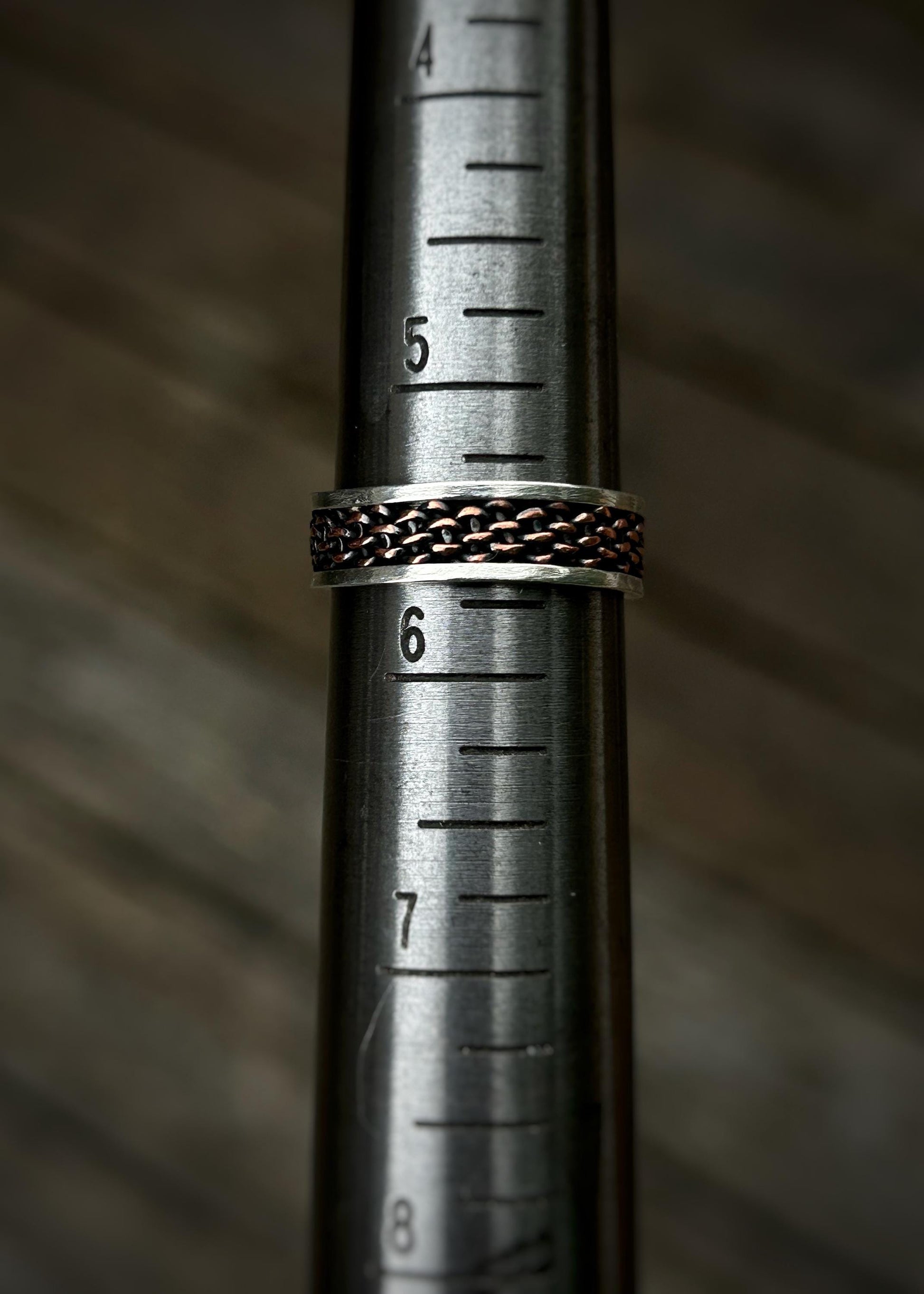 This handmade ring features a 6 strand copper basket weave framed by and soldered to sterling silver wire. It is soldered together at the seam which is shown in the final picture.
