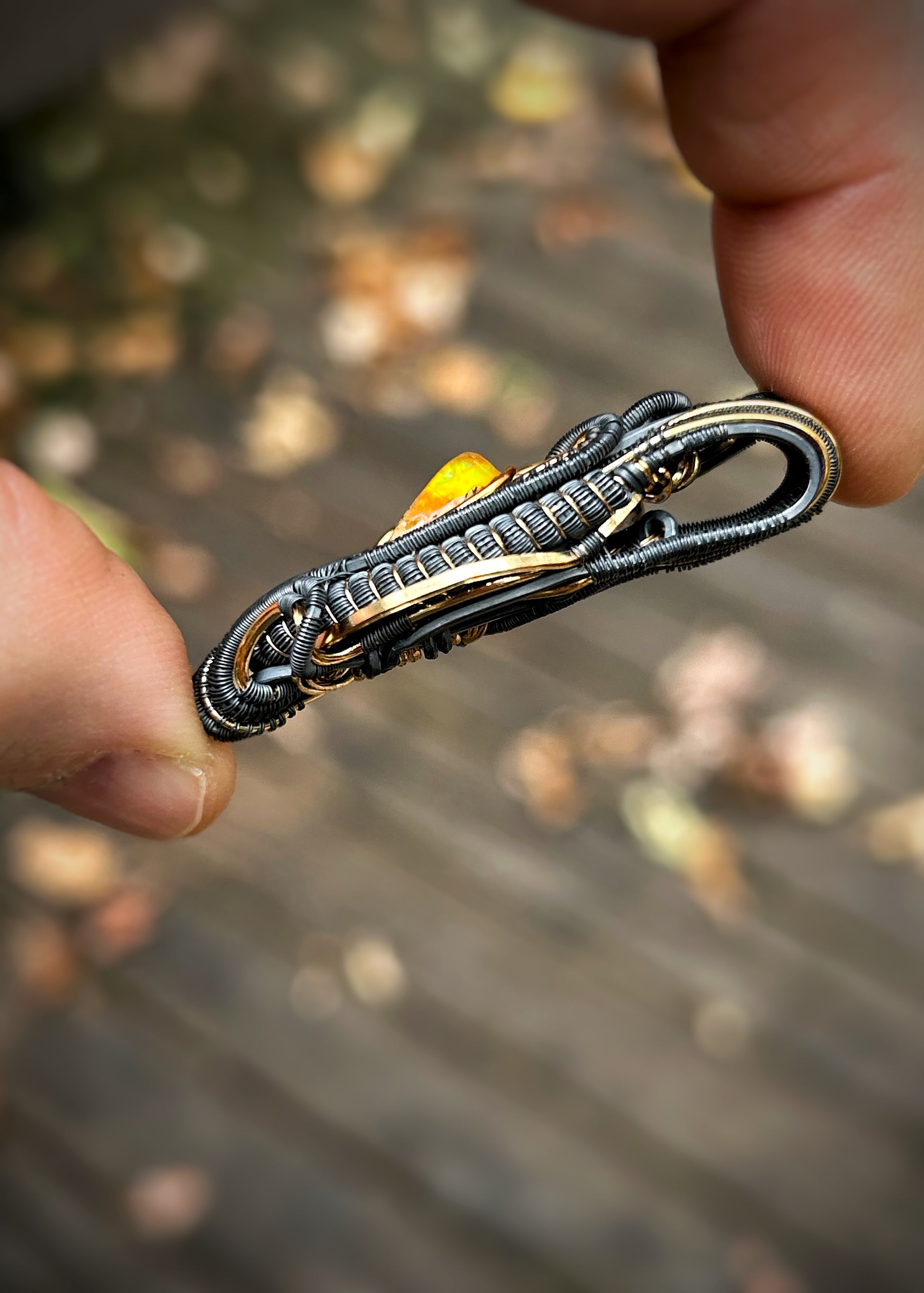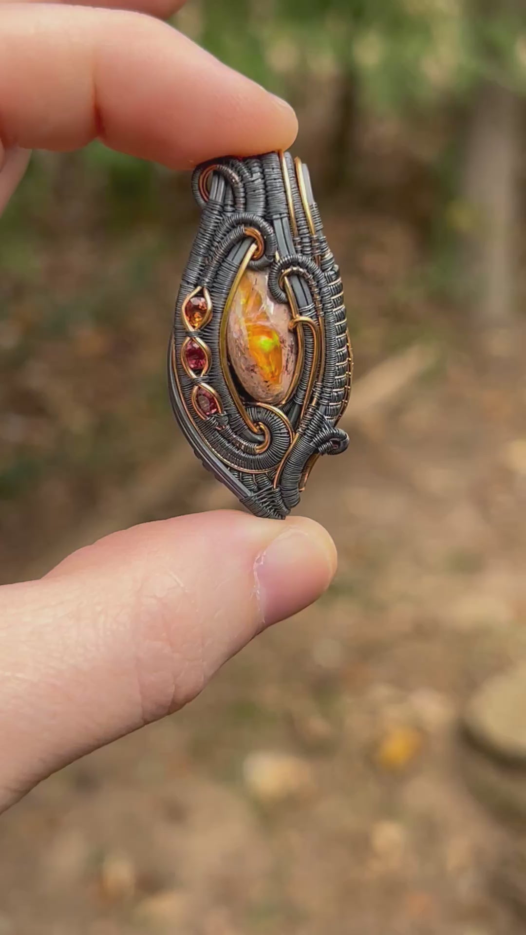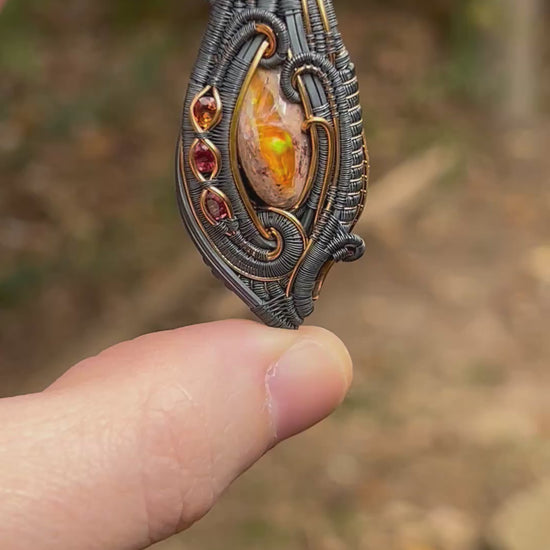 Autumnal Fire Opal Pendant // Multicolor Sapphires // Oxidized Silver // Mixed Metals // Goldfill // Festival Jewelry // Wrapped Pendant