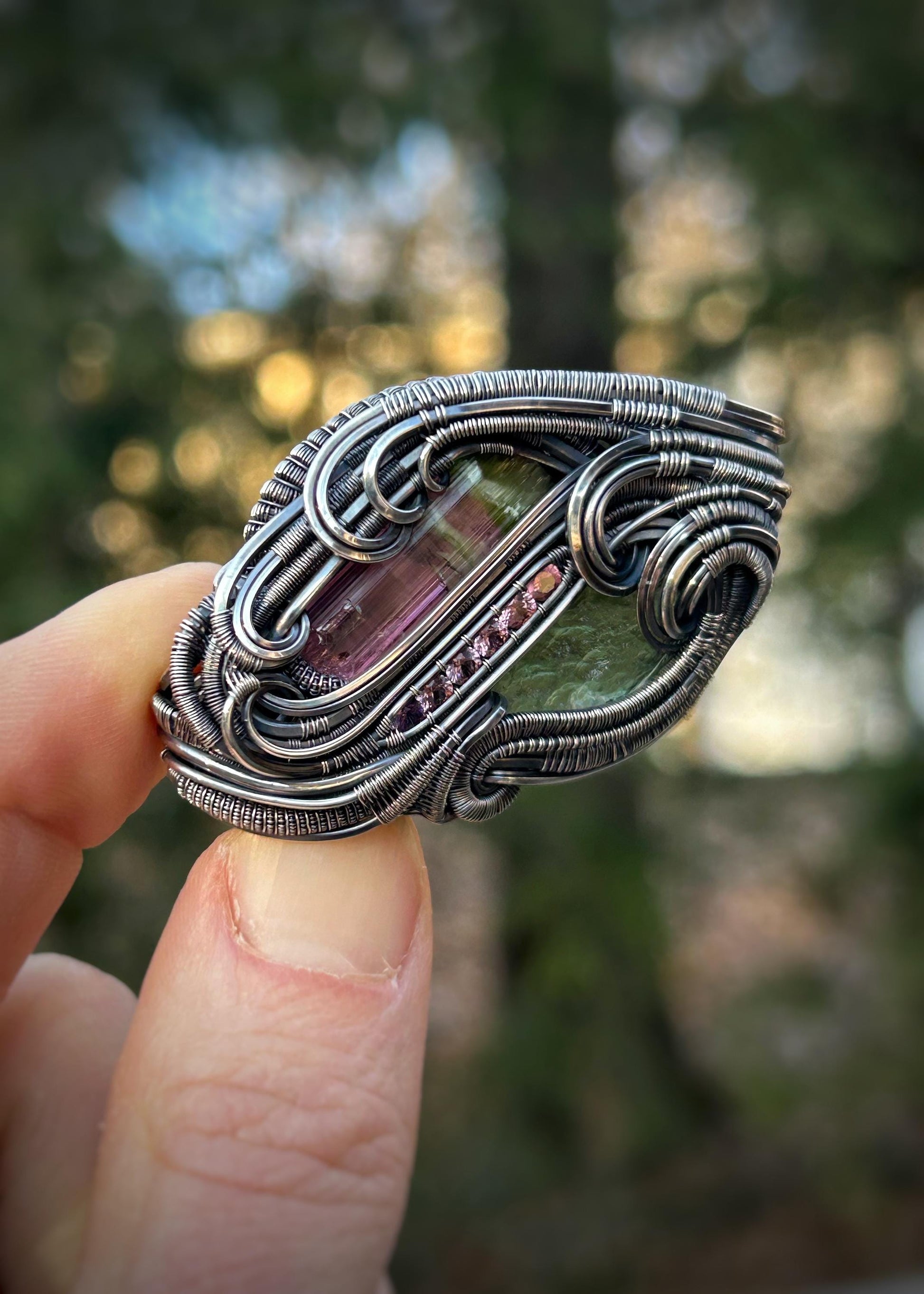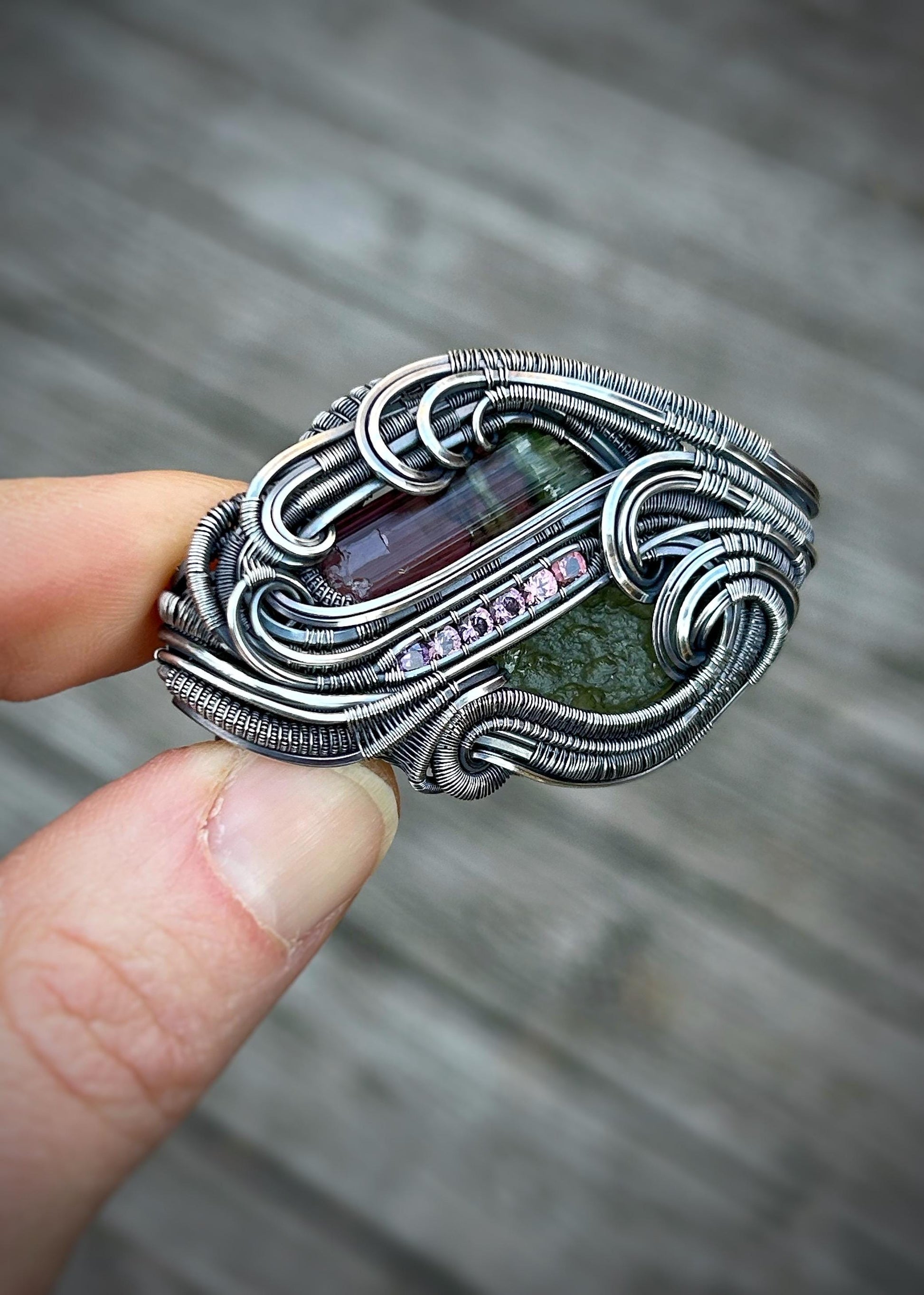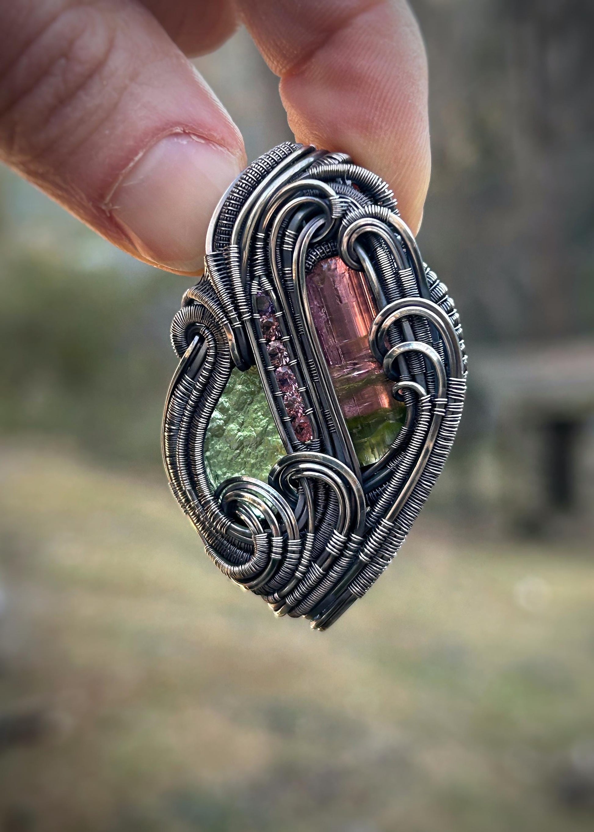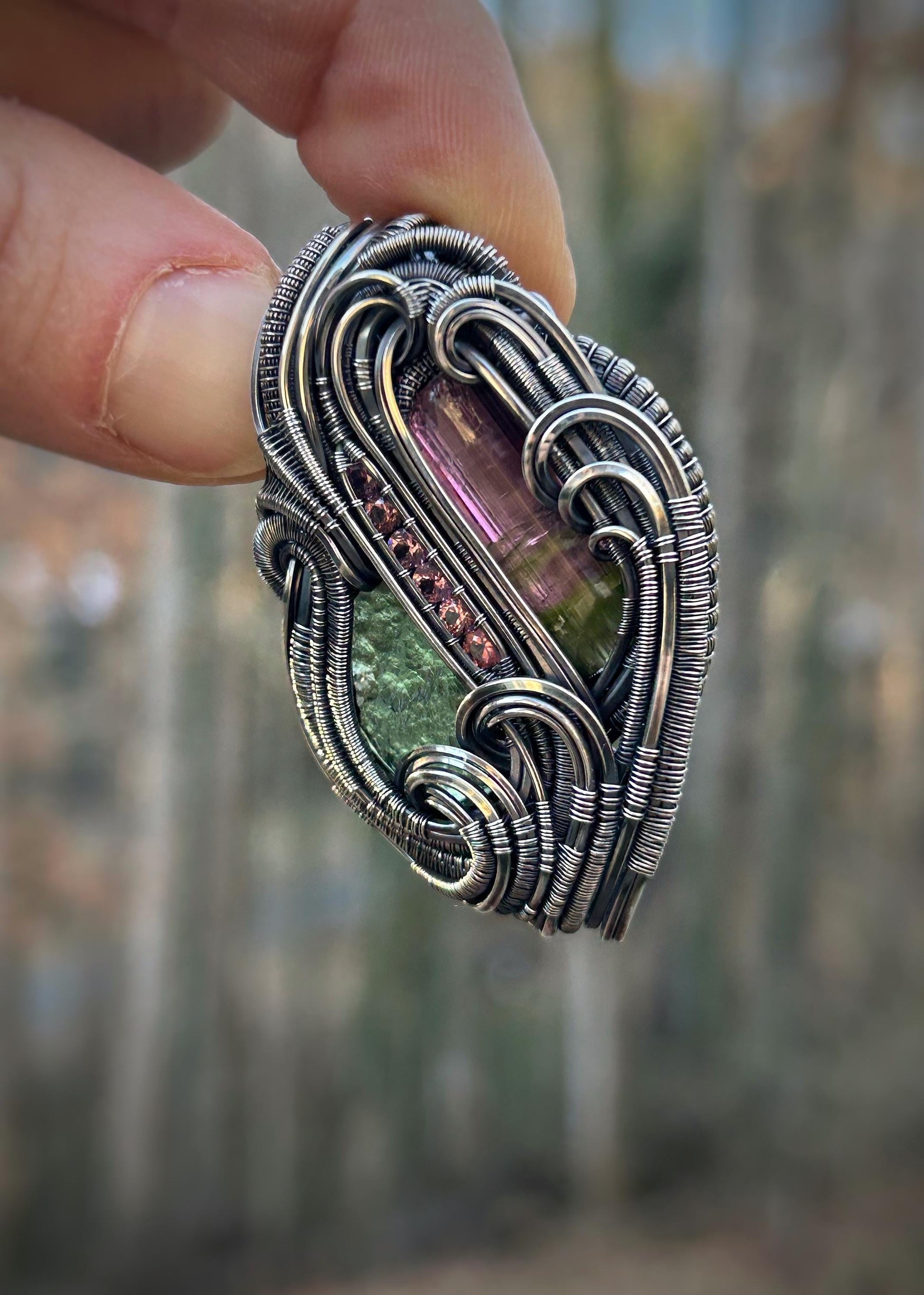 Bicolor Brazilian Tourmaline // Moldavite // Spinel Color Gradient // Oxidized Sterling Silver // Organic Wire Flow // Handmade Wire Art