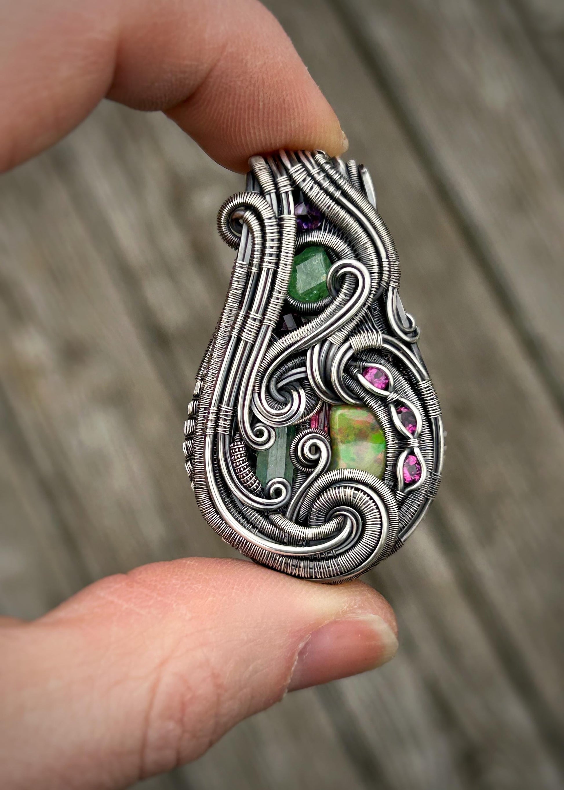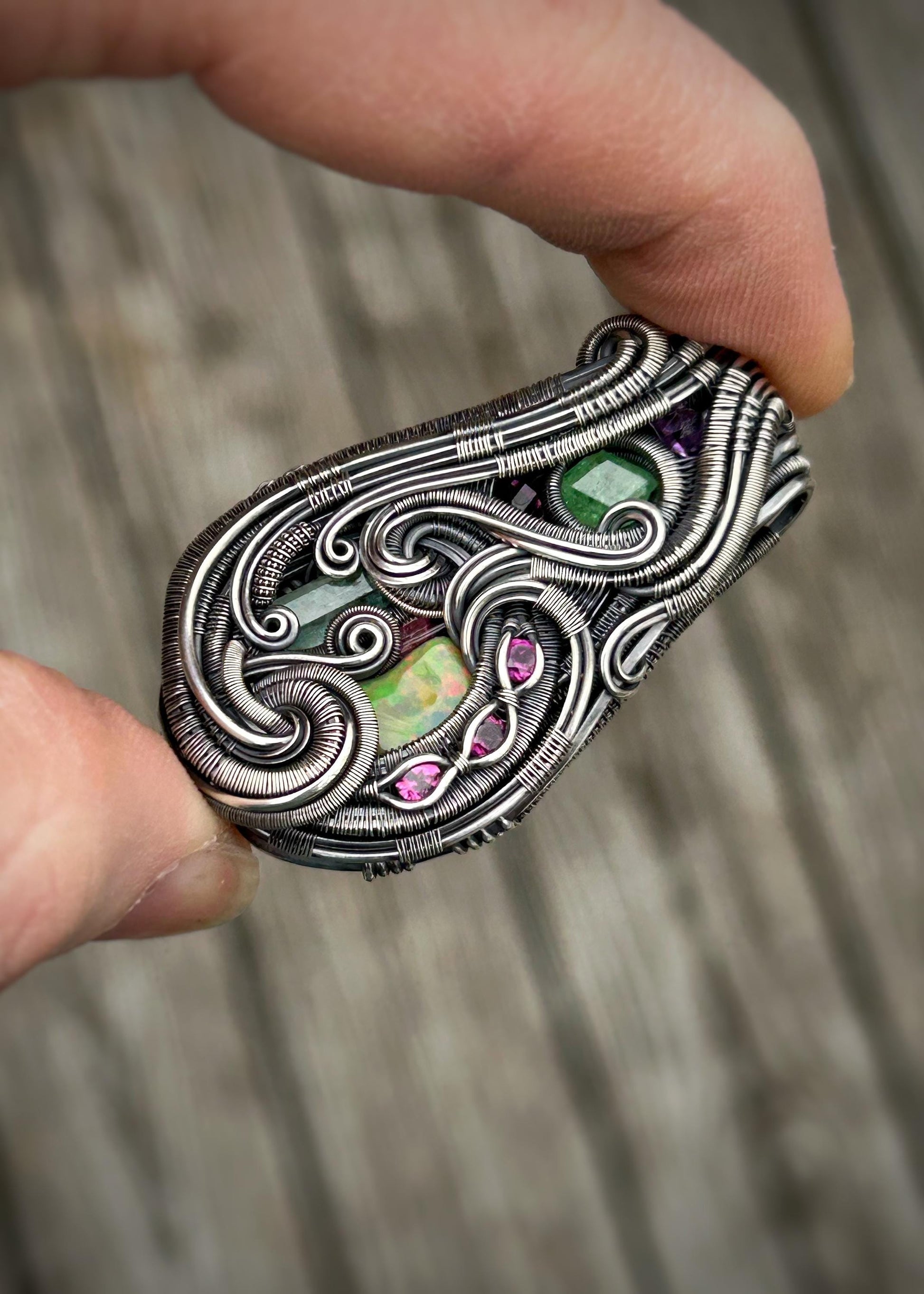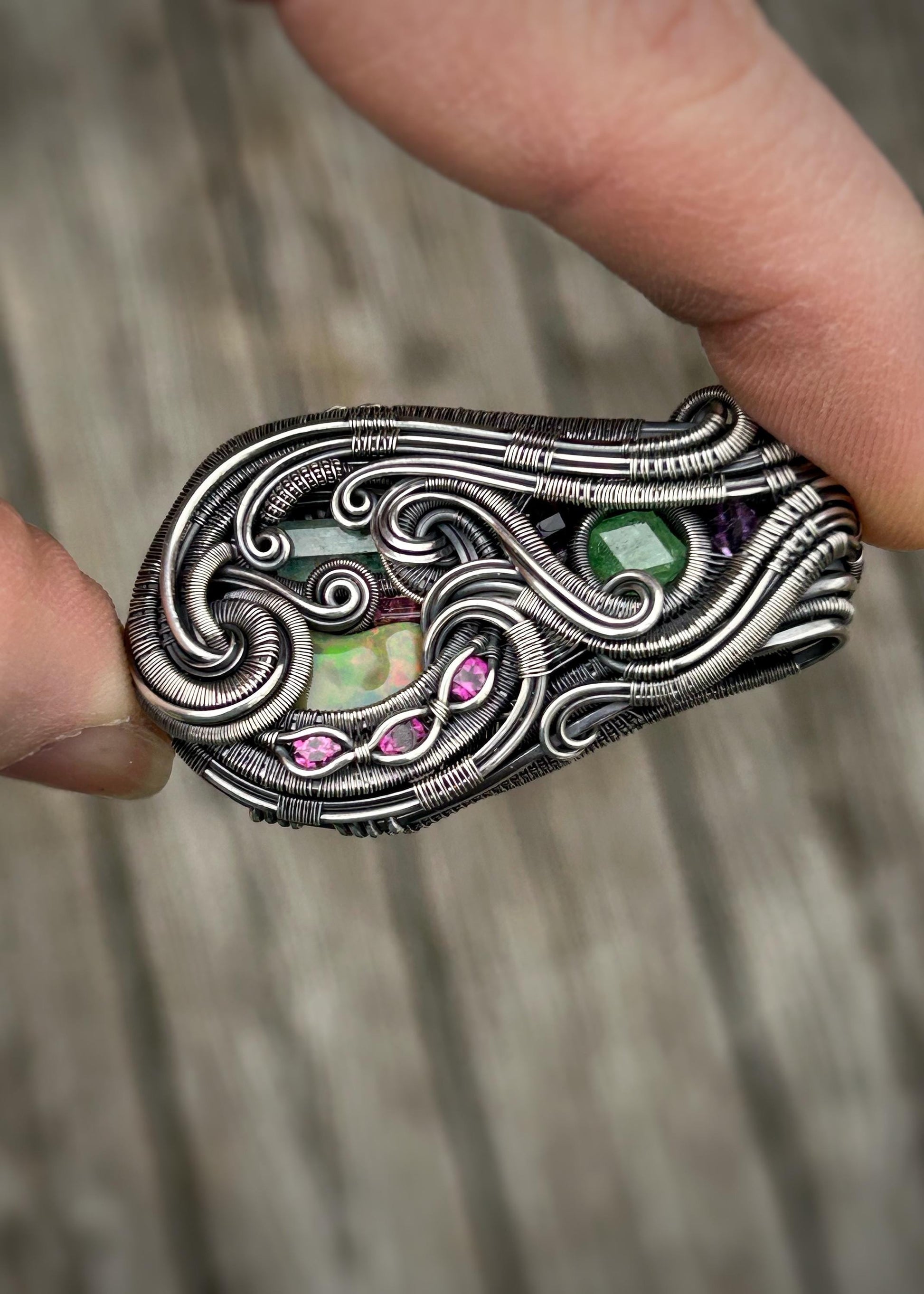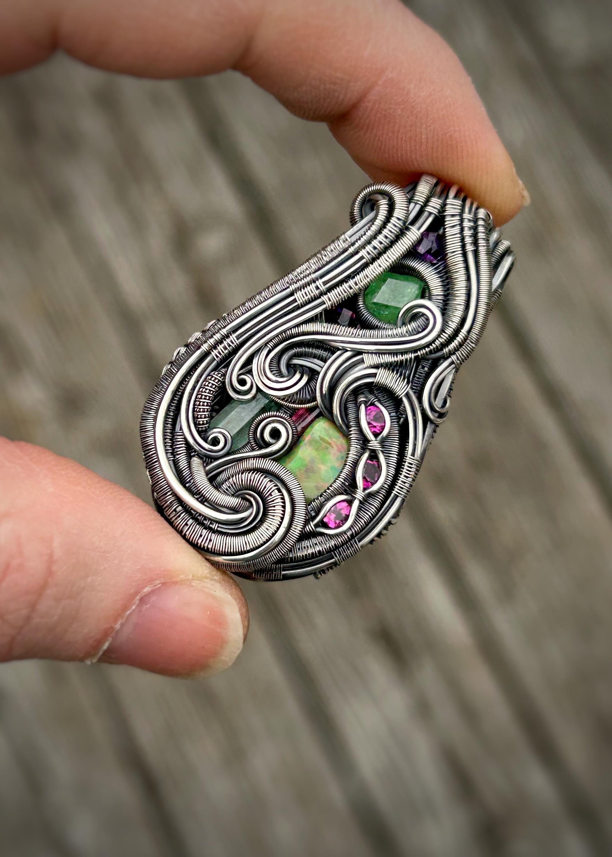 Jam Packed // Gems // Beryl // Tourmaline // Tsavorite Garnet // Australian Opal // Oxidized Sterling Silver // Organic Wire Flow // Jewelry