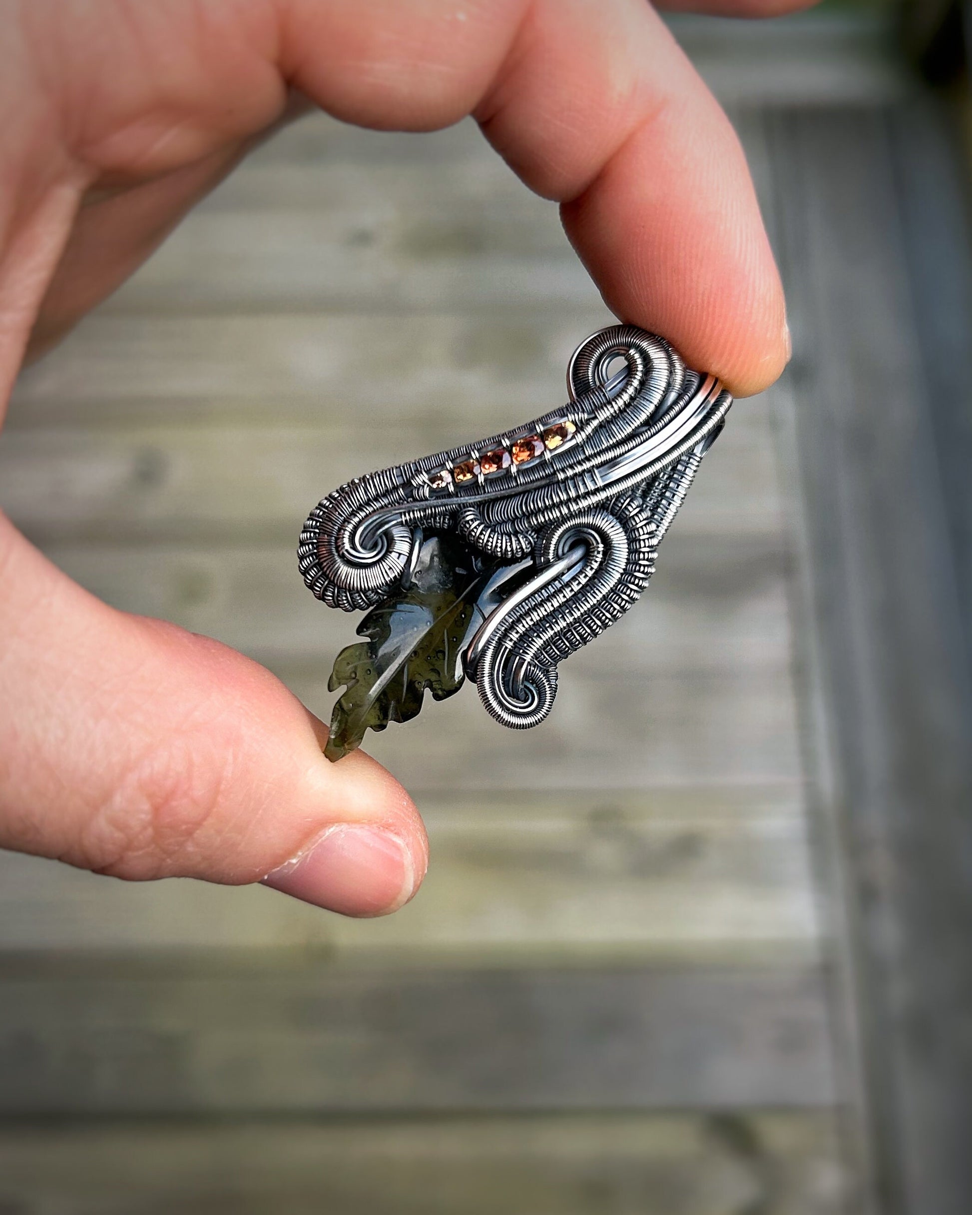 I wanted to give the moldavite leaf an exposed setting to depict a leaf clinging to its branch as the season passes.