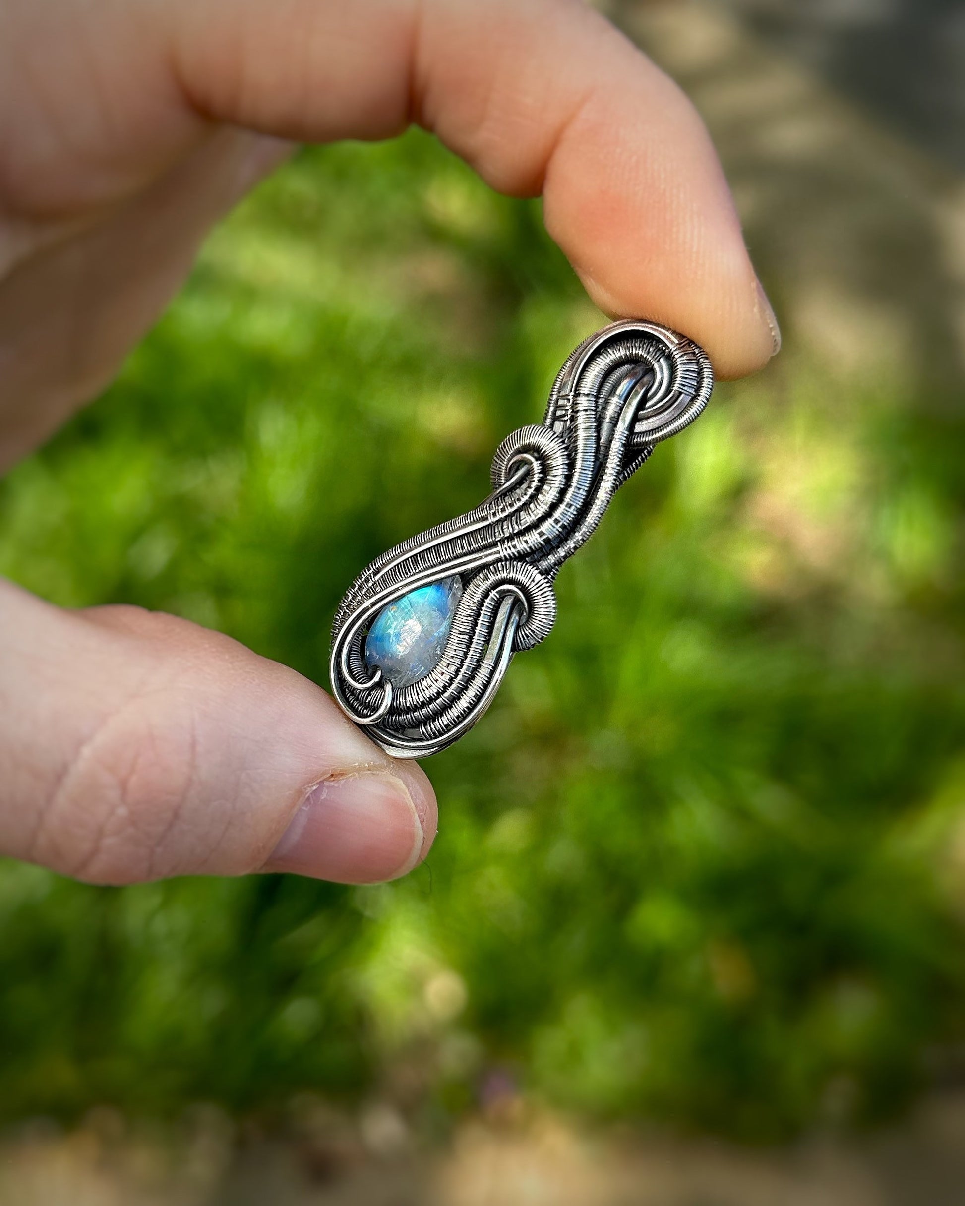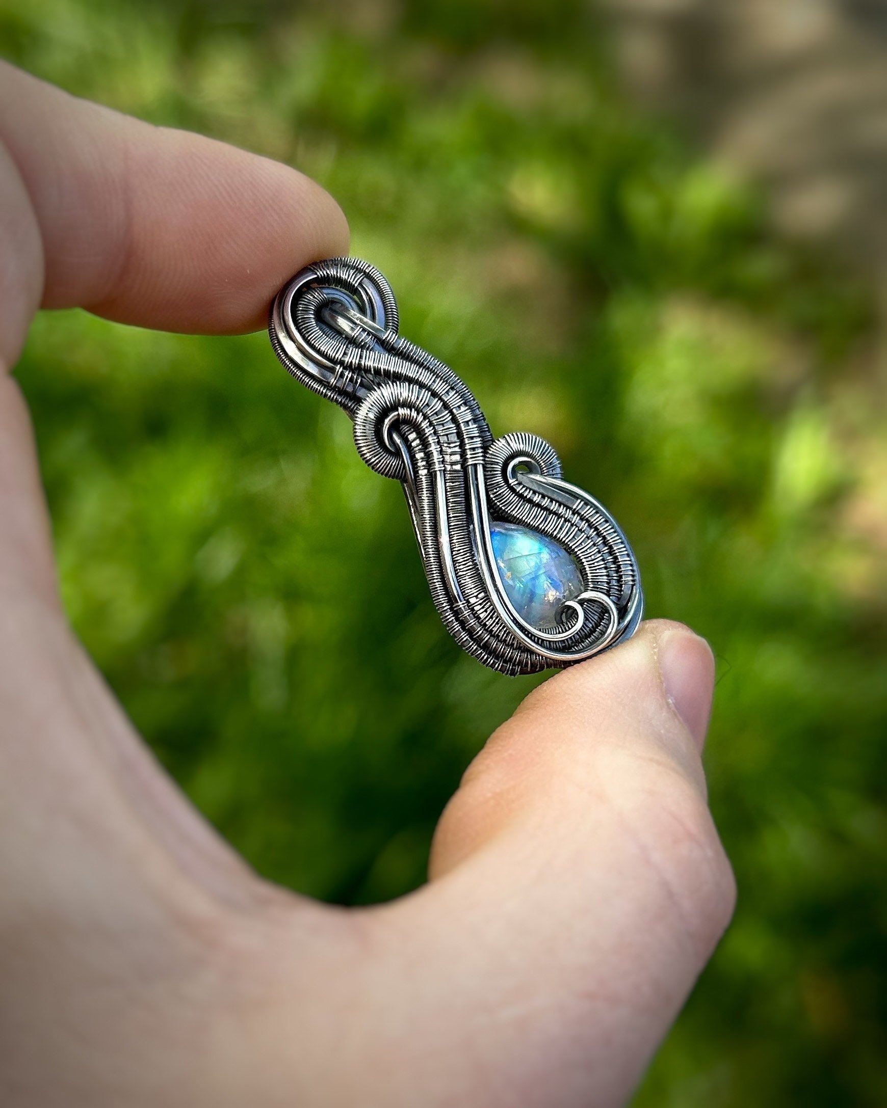 Moonstone Droplet // Rainbow Moonstone // Festival Jewelry // Oxidized Silver // Wire Flow // Organic // Sexy Pendant // Wire Wrapped