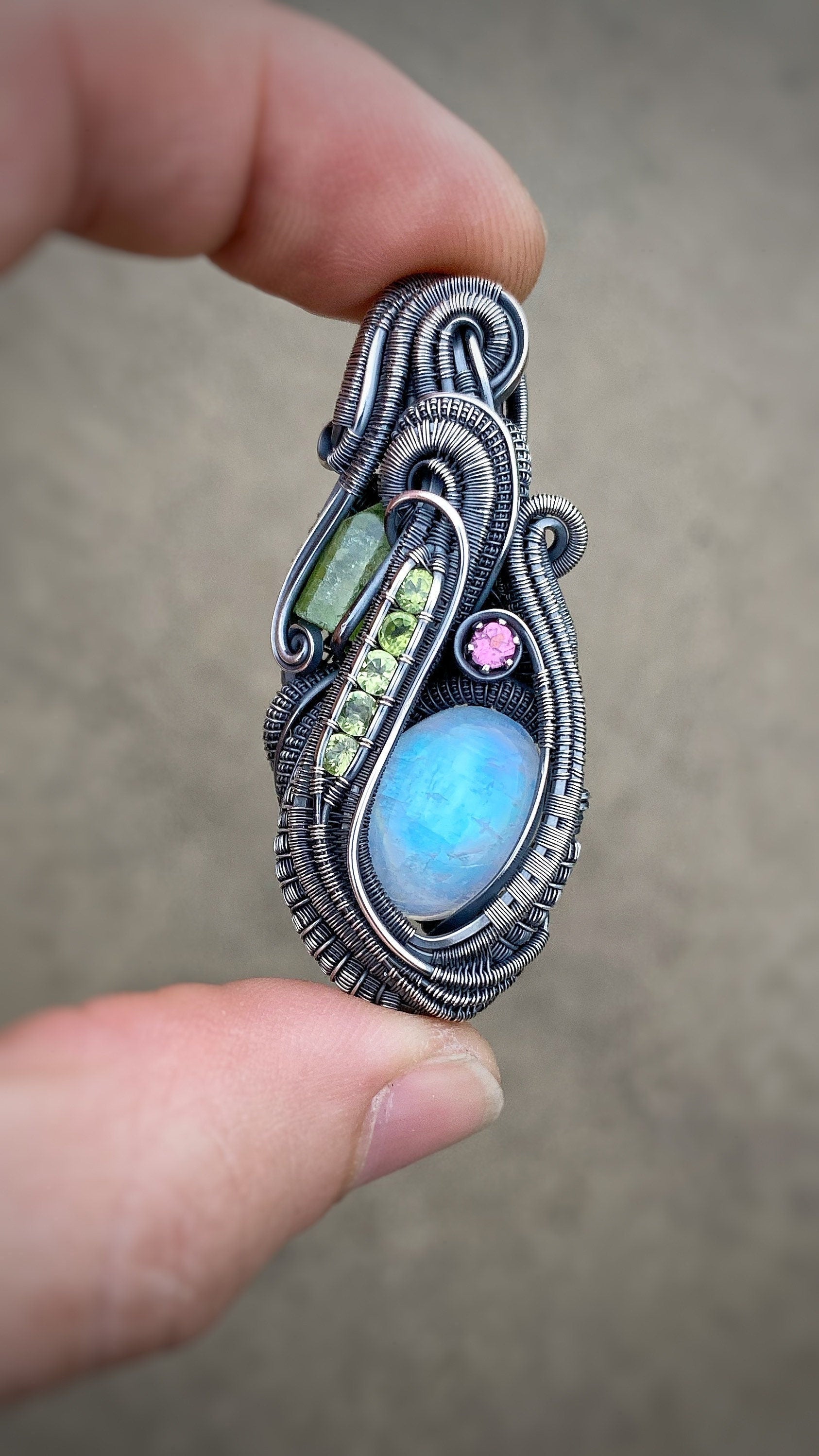 #rainbowmoonstone #moonstone #moonstonependant #moonstonejewelry #peridot #peridotjewelry #peridotpendant #pinktourmaline #oxidizedsilver #oxidizedsilverjewelry #festivaljewelry #wirewrap #wirewrappedjewelry #wirewrapping #wirewrappedcrystals #wirewrapsofig #wrapsofig #wrapsofinstagram #pendantsofig #pendantsofinstagram #riojeweler #handmade #wireart #wireflow #sexyjewelry #patina #innerorbitjewelry #innerorbit