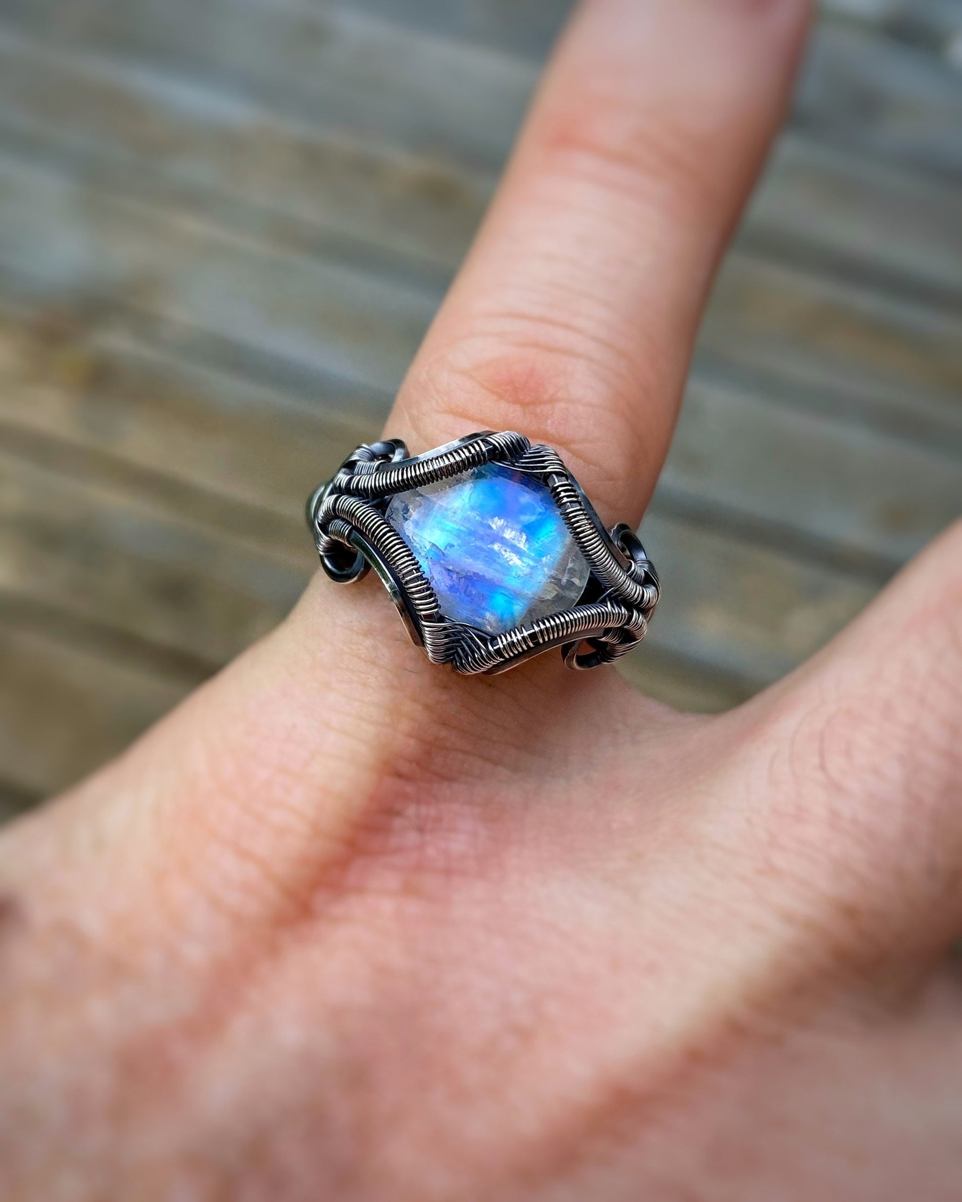 Moonstone Ring // Wire Wrapped Ring // Festival Jewelry // Oxidized Silver // Sexy // Size 6.5 // Elegant // Handmade // Sterling // Gem
