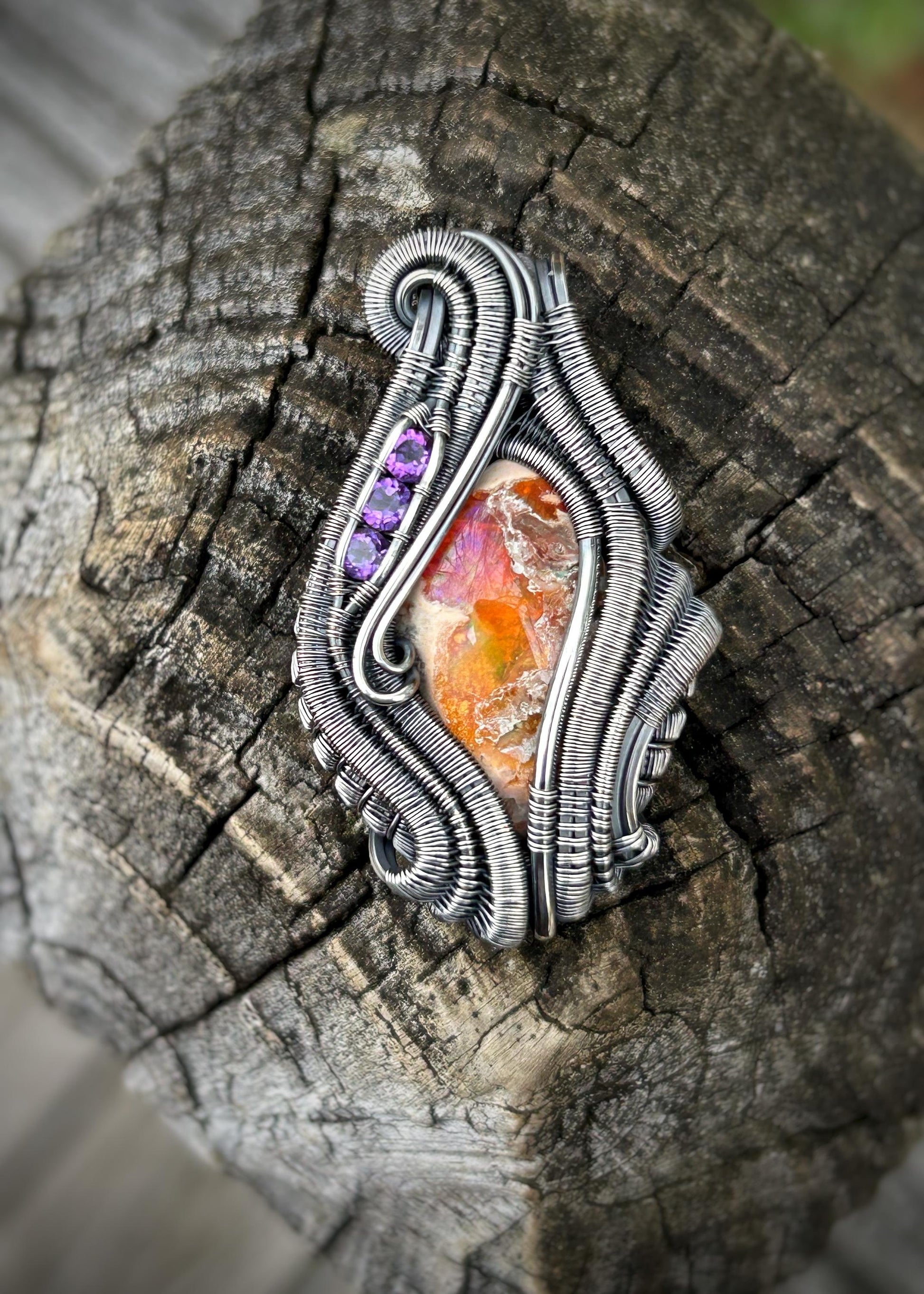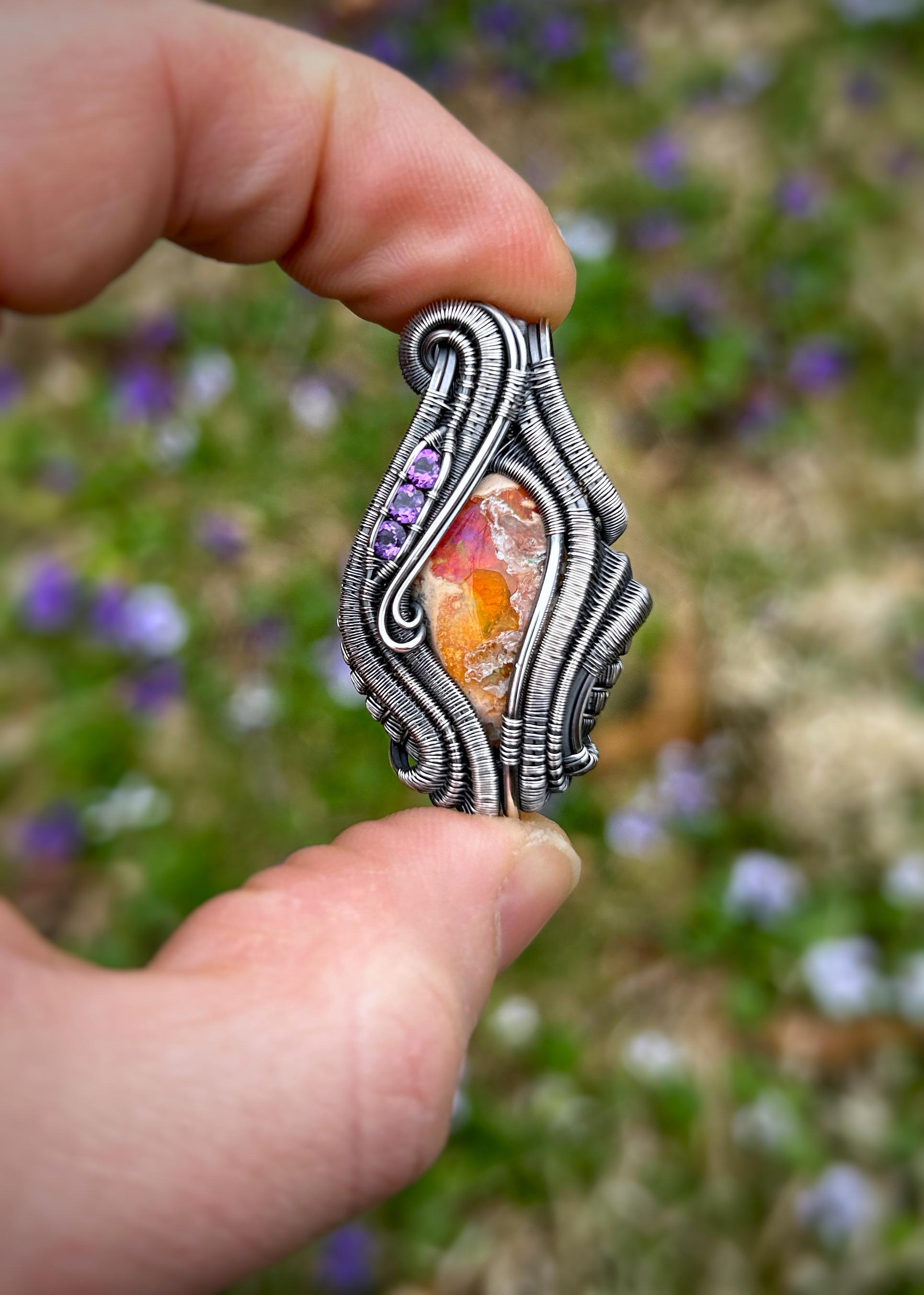 Purple Pendant // Amethyst // Mexican Fire Opal // Oxidized Silver // Wire Wrap // Festival Jewelry // Handmade Wire Art // Wire Flow
