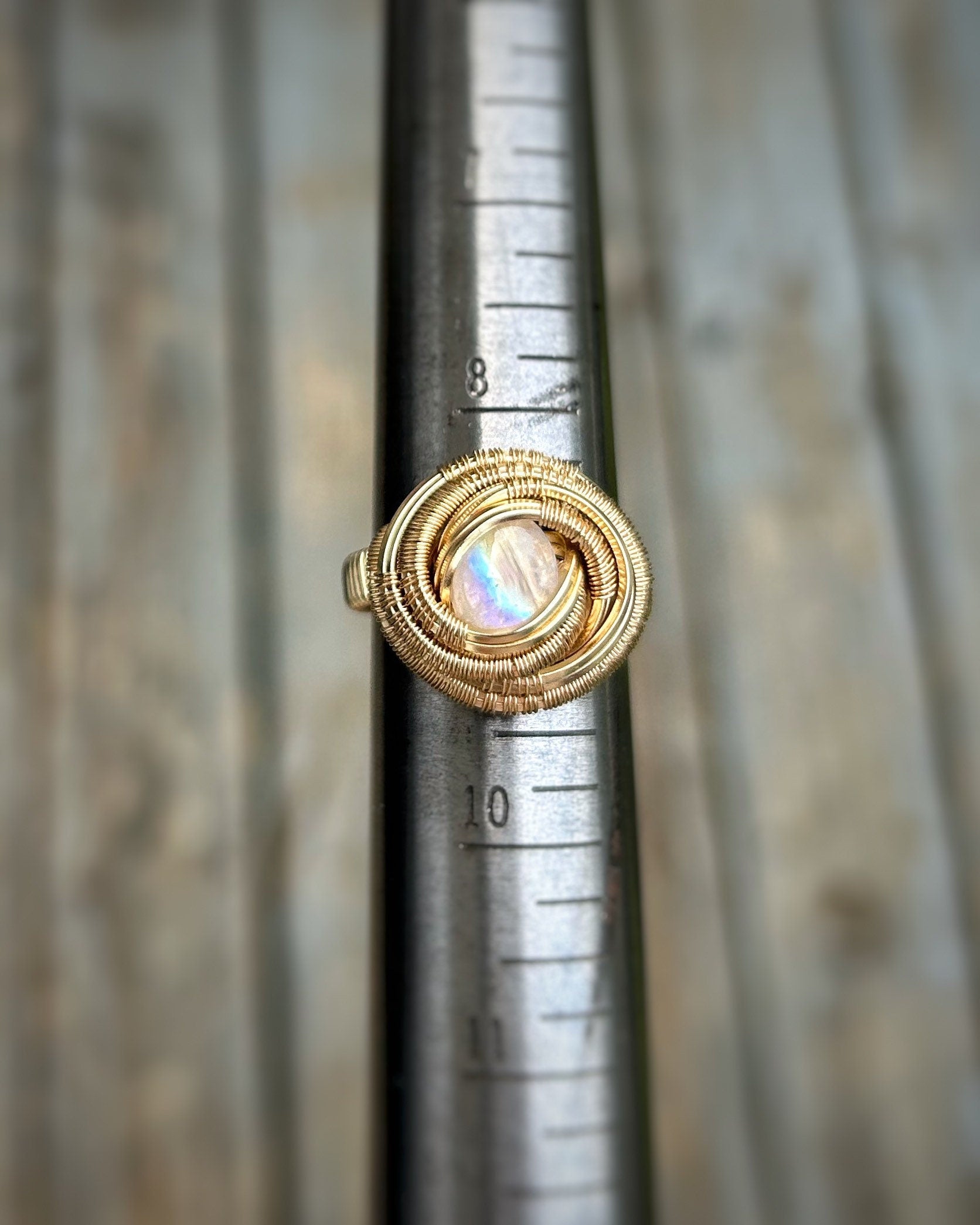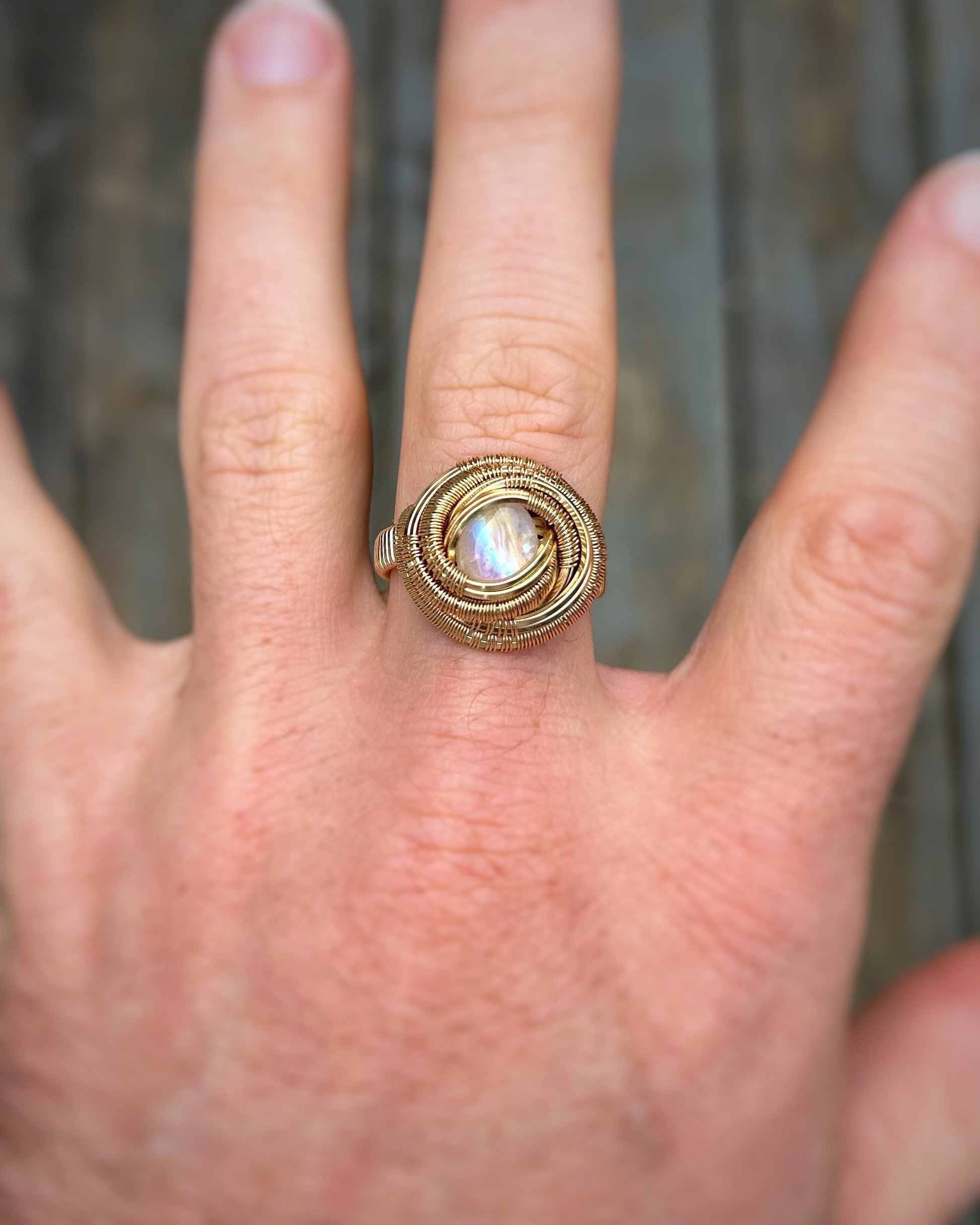 Whew.. ! This stone really puts the ‘Rainbow’ in Rainbow Moonstone. One of the cooler Moonstone cabochons that I’ve ever seen or worked with. The gold wire really compliments the gem nicely. I’m really happy with how tight and consistent the wrapping is on this one. I’m also proud of the dome shape of this ring’s profile. It makes a really smooth transition down to the surface of the finger. It’s a comfortable US size 9.