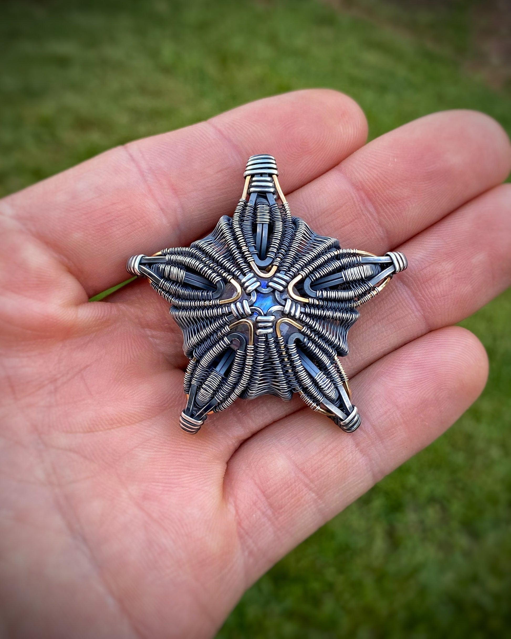 #star #starshape #starfish #sanddollar #oceanic #starpendant #symmetry #symmetrical #symmetricalpendant #symmetricaljewelry #wirewrap #wirewrapping #wirewrappedcrystals #wirewraps #wirewrapsofig #wrapsofig #wrapsofinstagram #pendantsofig #pendantsofinstagram #sacredgeometry #riojeweler #rainbowmoonstone #moonstone #moonstonependant #moonstonejewelry #innerorbitjewelry #innerorbit