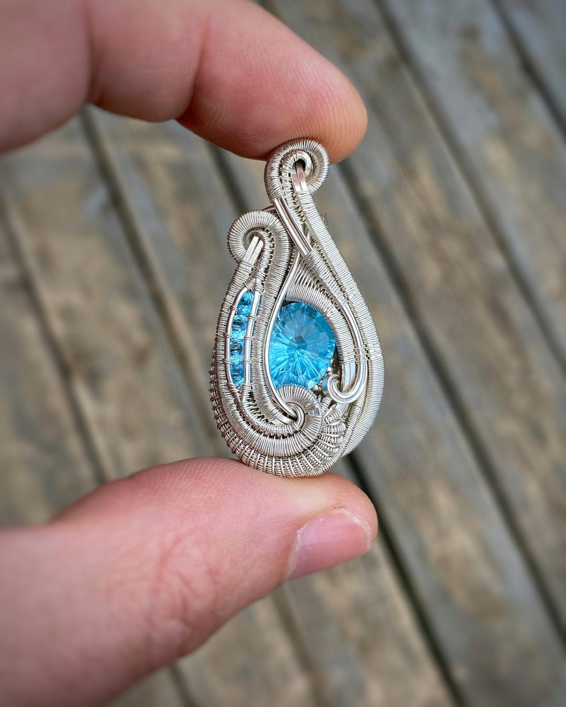 Swiss Blue Topaz // Baby Blue // Wire Wrap Pendant // Festival Jewelry // Sterling Silver // Water Droplet // Handmade // Wire Art