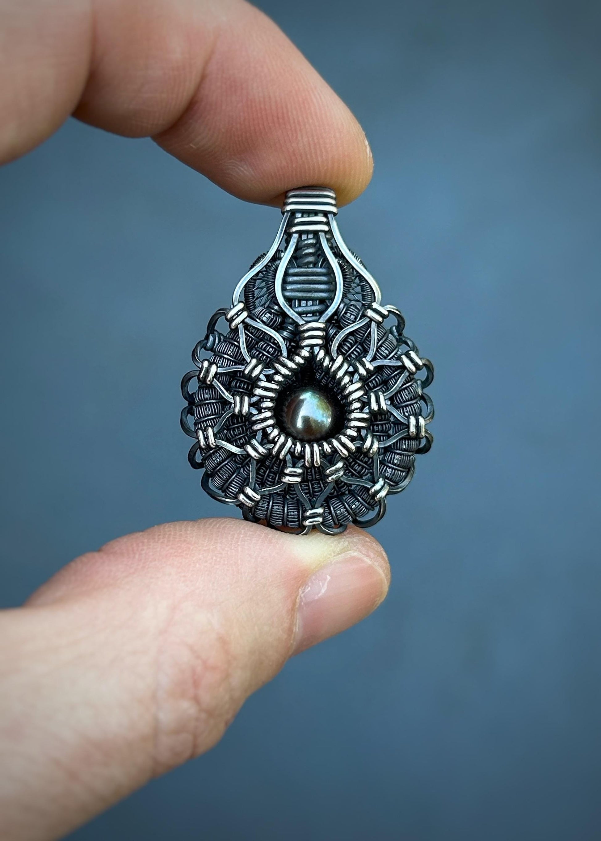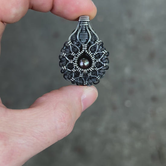 Symmetrical Pearl Pendant // Wire Wrapped // Oxidized/Polished Silver // Tahitian Black Pearl // Festival Jewelry // Sacred Geometry