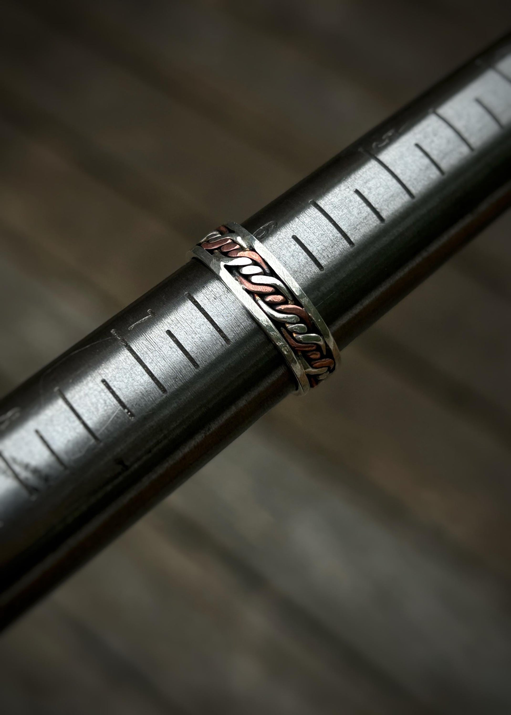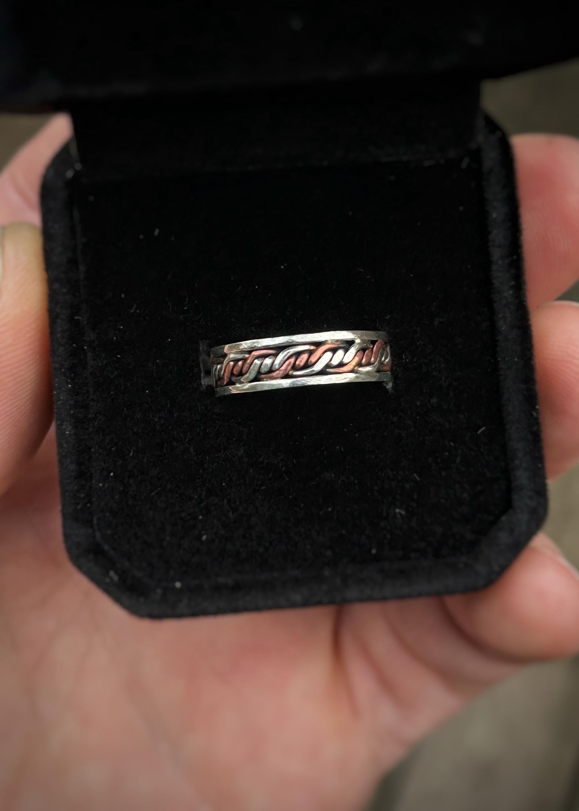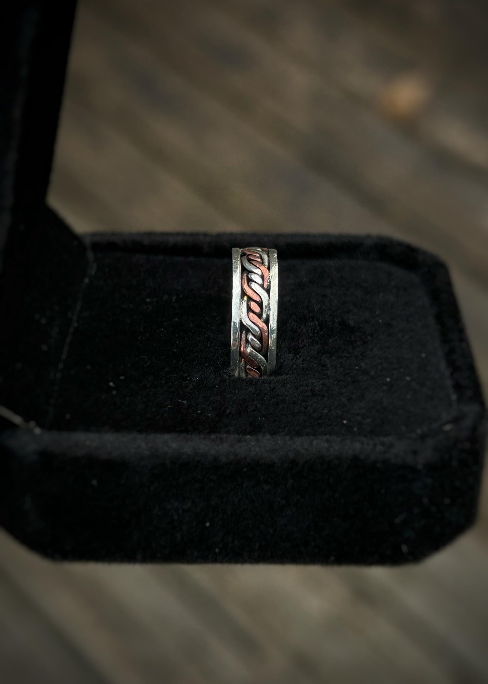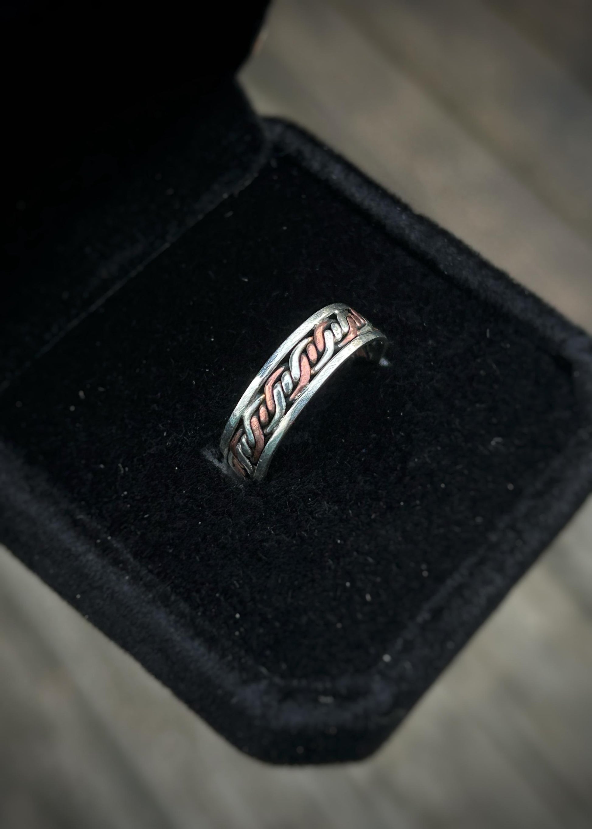 This handmade ring features a triple twist, 4-strand copper and silver alternating braid framed by and soldered to sterling silver wire. It is soldered together at the seam which is shown in the final picture.