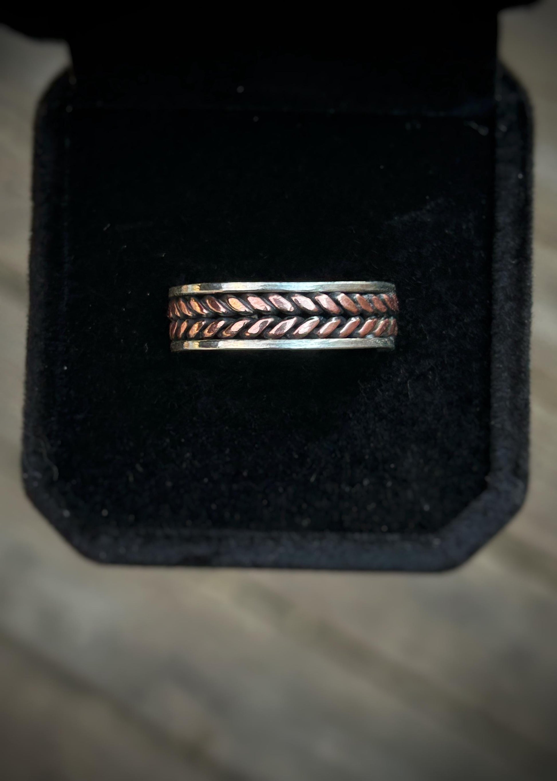 This handmade ring features a two-wire copper wheat pattern framed by and soldered to sterling silver wire. The ring band is soldered together at the seam which is shown in the final picture.